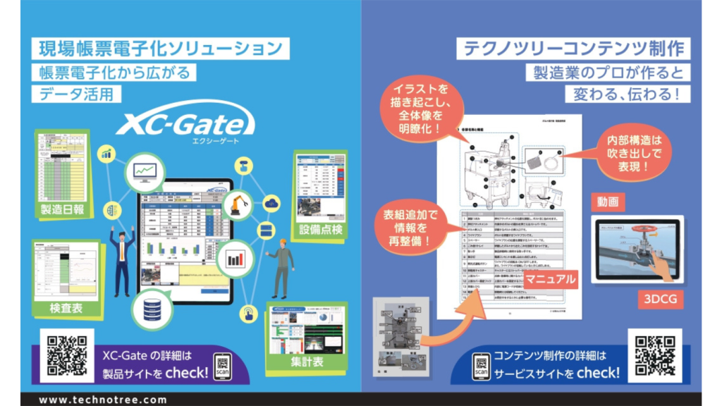 裏面には弊社製品である現場帳票電子化ソリューション「XC-Gate」と、マニュアル制作等を手掛けるコンテンツ制作サービスをそれぞれご紹介しております。かわいいペットたちだけではなく、裏面までご覧いただけますと幸いです。「XC-Gate」は日報、点検表、検査表といった様々な帳票の電子化イメージと「XC-Gate」ならではであるデータ活用ができる集計表のイメージを掲載しております。コンテンツ制作は製造業を熟知したマニュアル作成のプロが、わかりにくいマニュアルのブラッシュアップ例をご紹介しております。