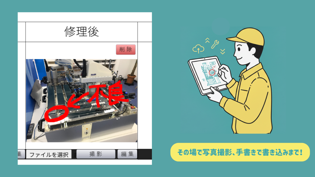 これにより、言葉だけでは伝わりづらかった現場の状況を写真や手書きの書き込み機能を用いて、正確に伝えることができ、社内でのスムーズな情報共有と、将来のトラブルに対する確実な備えが可能になります。