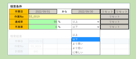 達成率は「以上」「以下」などを条件をプルダウンで指定が可能です。