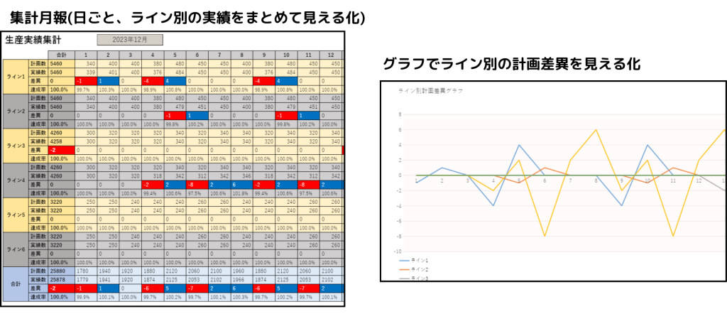 ラインごとの稼働進捗を見える化できる生産管理板ですが、ライン全体での動きをまとめて精査したい場合には各ラインの生産管理板を集めて再集計する作業が必要になります。日ごとに作る製品や計画数も異なるなか、それらを人が集計するにはさらなる時間がかかります。