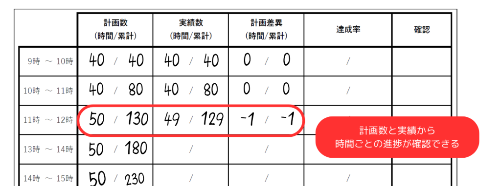 生産管理板は、製造業において工程全体の作業進捗を「見える化」するためのツールです。時間ごとの生産実績を記入することで、作業計画に対する現在の進捗を一目で把握して素早い対応が可能となります。