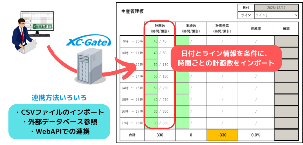 しかしXC-Gateが紙やホワイトボードでの運用と最も違う点は、生産管理システムなどからデータをインポートし、作業指示データが入った帳票を自動生成できるところにあります。あらかじめ現場に用意されたタブレット・PCですぐに生産管理板を開いて入力することができるので、現場のホワイトボードへ作業計画を一つ一つ記入したり、Excelで生産計画を入力・印刷した生産管理板を配布する必要がなくなります。