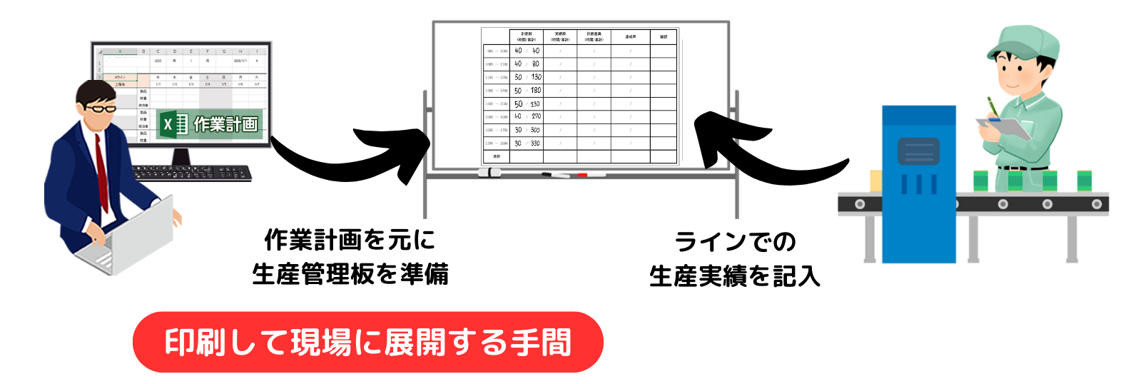 作業計画に対する進捗を記録していくため、まずはじめに計画を生産管理板へ記載する必要があります。紙の生産管理板であればラインごとに1枚ずつ印刷して現場に配布したり、あるいは生産管理板をホワイトボードで運用する場合は手書きでホワイトボード上に計画を記入したり…