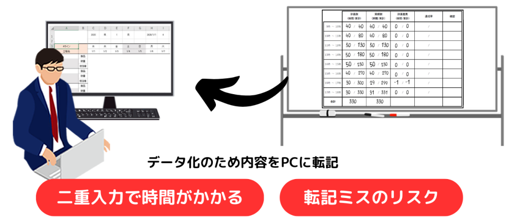 生産個数や作業時間など、生産管理板に書かれた多数の情報も、データ化するためにはパソコンへの転記作業が必要になります。単純な作業日報と比べても項目数が非常に多く転記に時間がかかるうえ、手作業での転記は見間違いや入力ミスが発生しやすく正しいデータを残すための労力もかかります。
