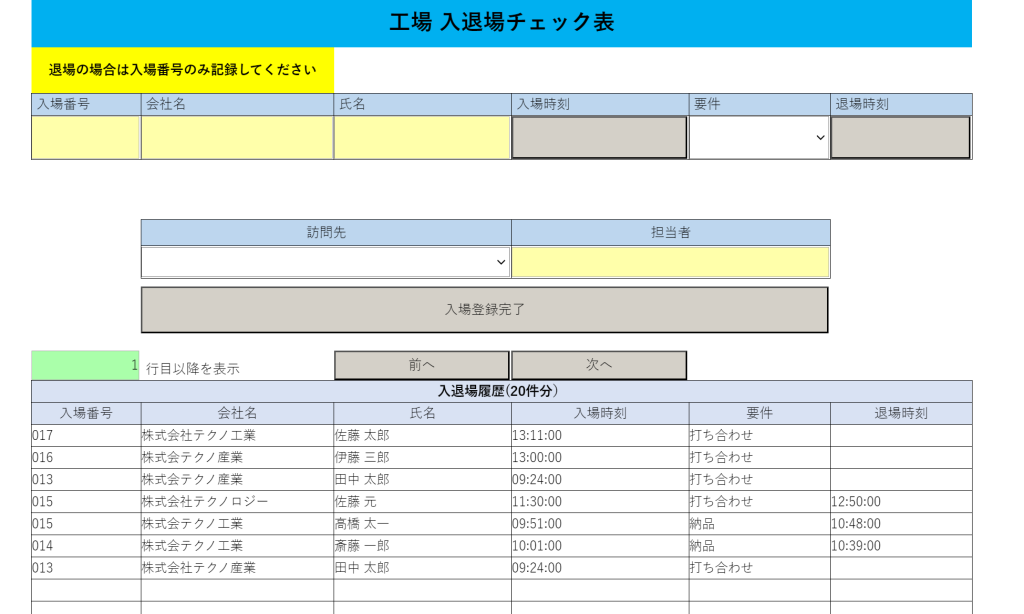 サンプル:作成が簡単な入退場記録
