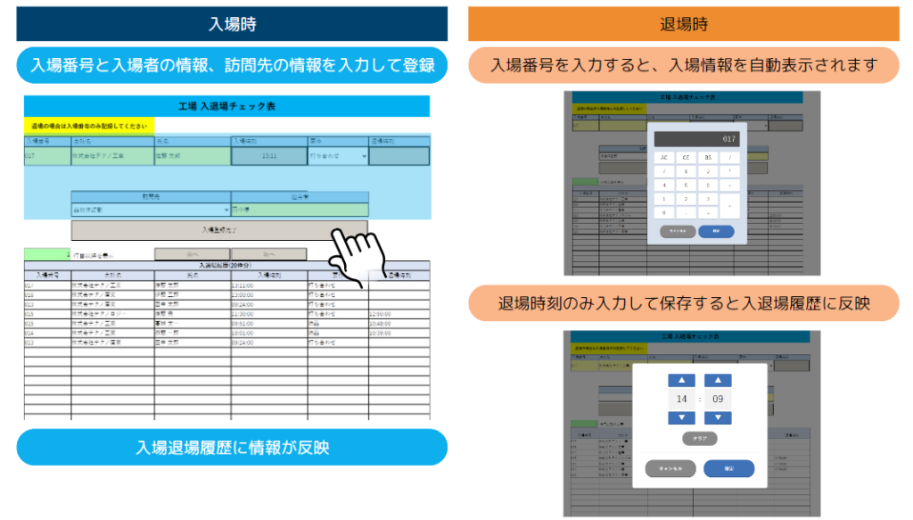 保存を自動化すれば、紙で運用していたときと同様に、入場時刻と入場者情報、退場時刻を記録するだけで完結します。