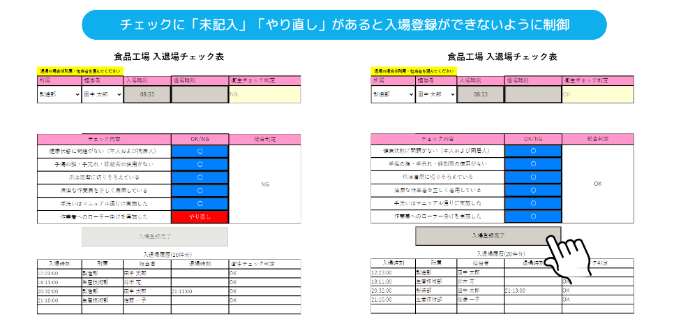 食品工場へ入場するために、従業員情報に加えて衛生チェック記録も登録することができます。衛生チェックに記入漏れがあると登録できないように制御しているため、記入漏れを防止します。