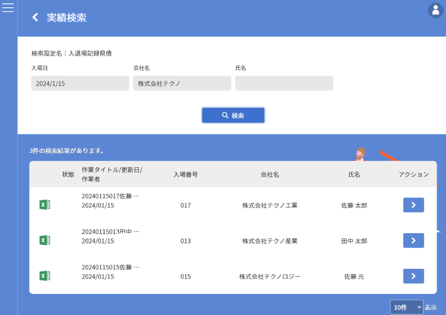 入退場の記録が1人1件登録されるようになるため、会社名や名前で検索することができます。実績の検索を使うと、過去の入退場の記録をすぐに把握することが可能です。