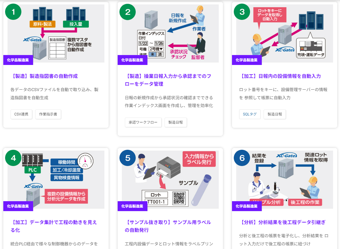 特に今回のソリューションマップでは、材料投入量や品目など、生産管理システムが持っているデータとの連携や、PLCを介した設備稼働データとの連携を中心に紹介しています。「作業指示の現場展開に時間がかかってしまう」「設備データはとれているが、人が行う作業の記録は別管理になっている」といった課題をお持ちの方はぜひ各事例をご覧ください。