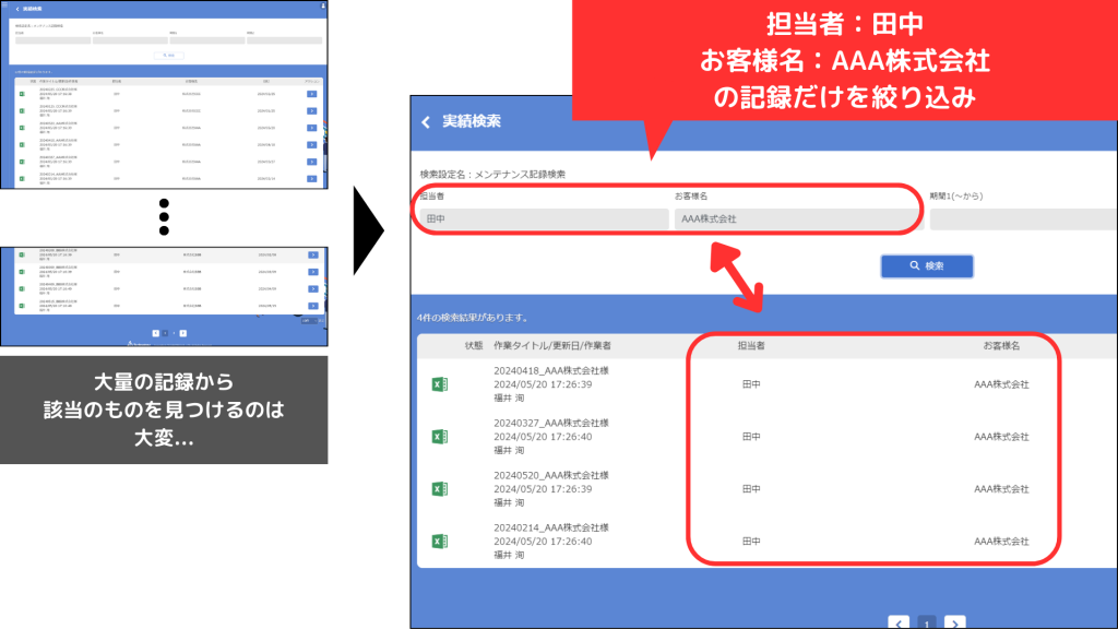 作業報告書をデータとして蓄積していくことで、必要な時に過去の記録をすぐに見つけて確認することができるようになります。例えば顧客へのサービスメンテナンスであれば、客先訪問前に前回の作業報告書をわざわざバインダーの中から探さなくてもPCやタブレット、スマートフォンなどから簡単に記録を閲覧し、作業の準備にかかる手間を減らすことにつながります。
