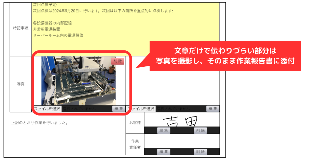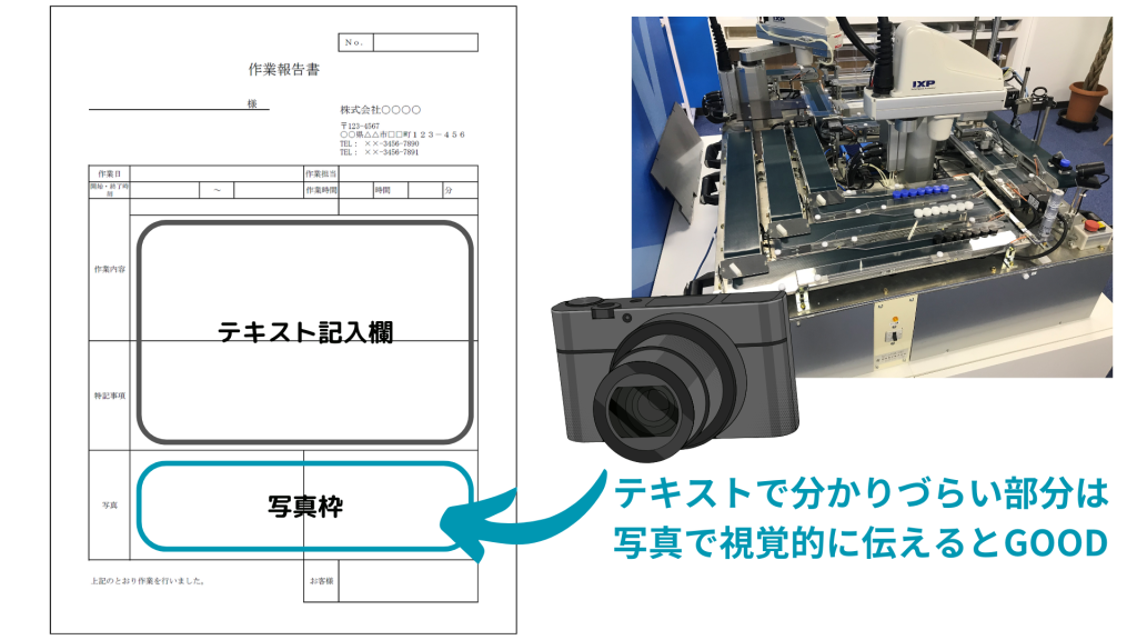文章だけで伝わりづらい作業内容には、画像や写真を添えることで内容がよりわかりやすくなります。例えば製品や設備などの修理を行う場合、修理前と修理後の状態を写真に残しておくことで、どのような対応がなされたのかを視覚的に把握することができます。また対応後の写真は作業を行った証跡にもなるため、作業内容に対する信頼性の向上にもつながります。
