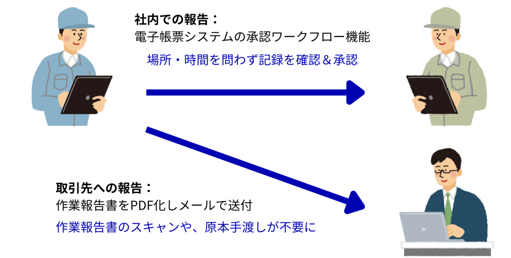 作業報告書が紙の場合、社内での報告時には紙の記録の提出が、取引先に対しては原本を作業完了時に渡したり、後からスキャンデータを送る作業が発生してしまいます。