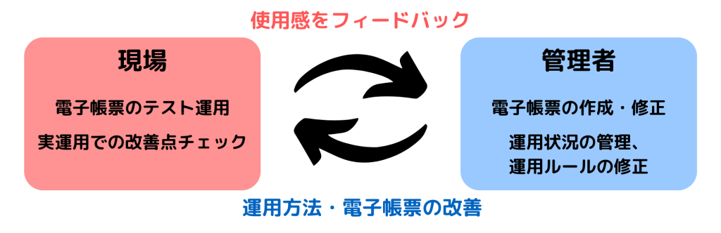 電子帳票をはじめ、ITツールの導入は現場からすると煩わしく感じられやすいものです。テスト運用にあたっては、しっかりと期間を決めて、それ以降は必ず電子帳票に切り替えるという認識を朝礼などで繰り返し共有しつつ、現場からの要望にはできる限り素早く対応し、「自分たちの要望はちゃんと運用に盛り込まれるんだ」と現場の人々にも思ってもらえれば、より建設的な意見も出やすくなるでしょう。