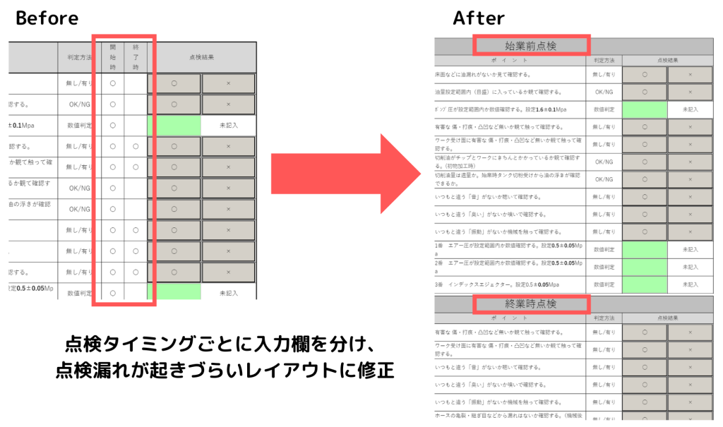 帳票の電子化は、普段できないような帳票レイアウト変更のチャンスでもあります。例えば、下図左側のように始業時・終業時の点検項目が混在していて見づらい場合には、点検タイミングごとに入力欄を整理するだけでも点検忘れが起きづらくなります。