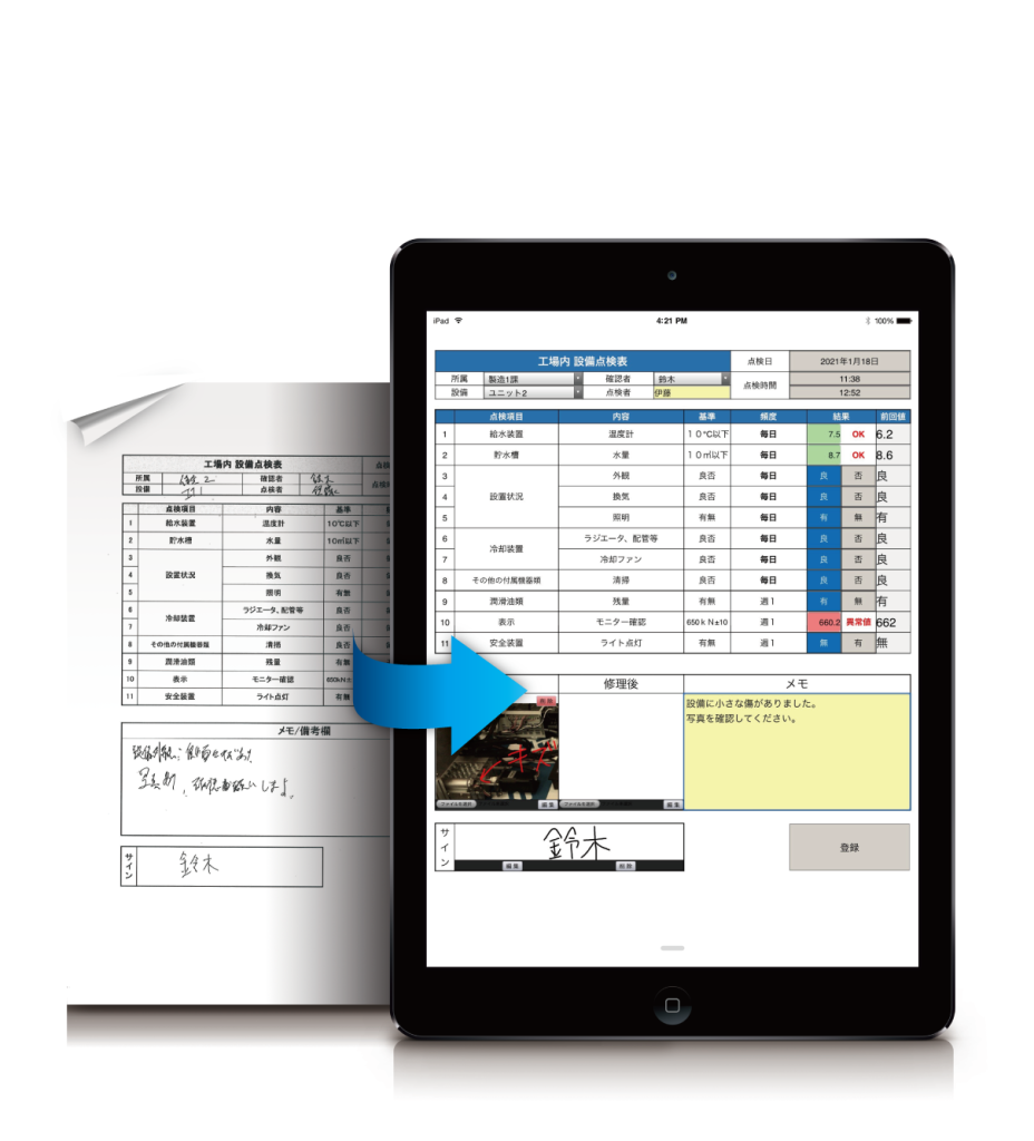 「チェックシート」「日報」といった記録用フォーマットを電子化し、タブレットからの入力・データ化を可能にする現場帳票電子化ソリューションです。