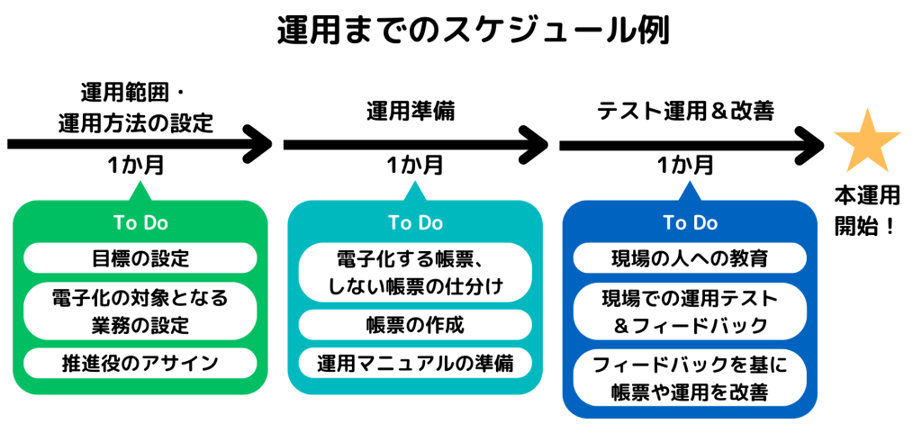 どんなに便利なツールであっても、導入していきなり現場で使うのは至難の業。実際に電子帳票を使っているユーザーの皆様も、実際の運用がスタートする前に様々な準備やテスト運用をされることが多いです。上のスケジュール例では、実際に帳票電子化を成功させた様々なユーザーの事例を基に、運用を軌道に乗せるための要素をまとめました。