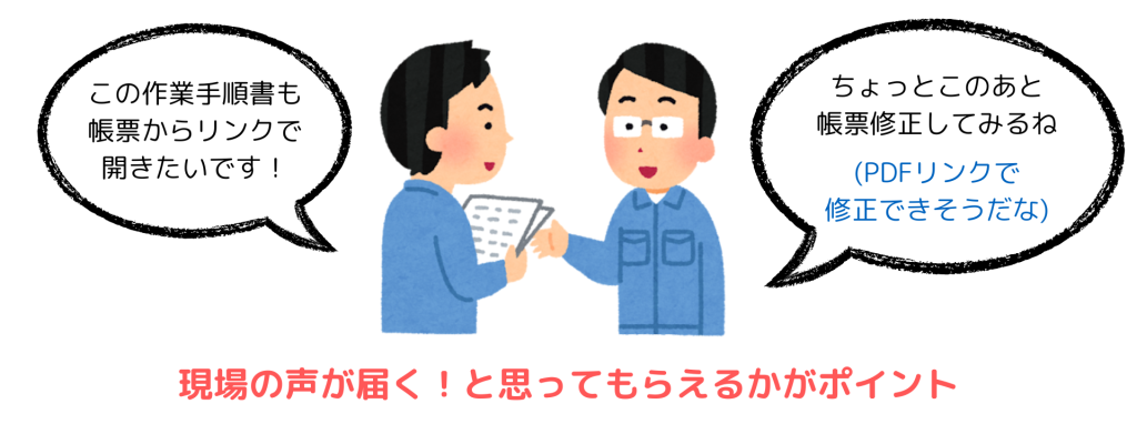 全体を管理する立場・現場で入力を行う立場では、抱えている課題も当然ながら異なります。管理者だけがデータ化でメリットを得るのではなく、帳票の使用方法に関してできる限り現場の人にとってのお困りごとも解決できるような運用が理想です。