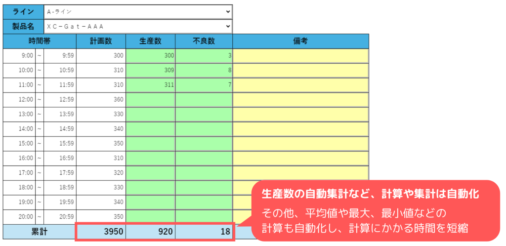 自動計算機能など、作業者に入力の手間を感じさせない運用も有効です。帳票に生産計画数や生産数、不良数などを入力すると自動で達成率や歩留まりが計算されるようにすることで、従来担当者が電卓を使いながら行っていた計算や集計の手間をなくすことができます。