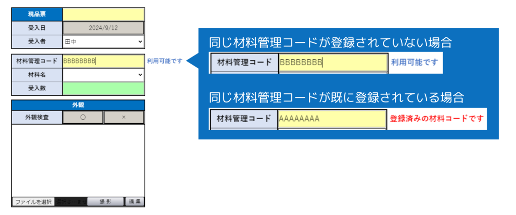 材料受入時の日付、担当者名、材料名、受入数(単位は省略)などを記録するシンプルな帳票で、「材料管理コード」が管理するためのキー項目になっています。この材料管理コードを入力する際、すでに同じ番号が登録されていないかをXC-Gateのデータタグという機能を活用して自動判定してくれます。
