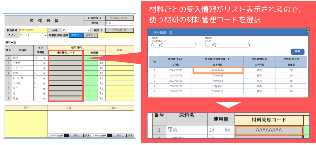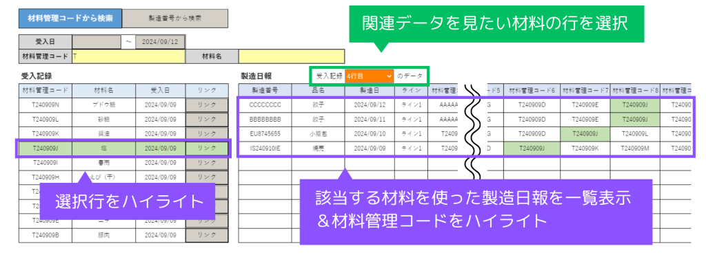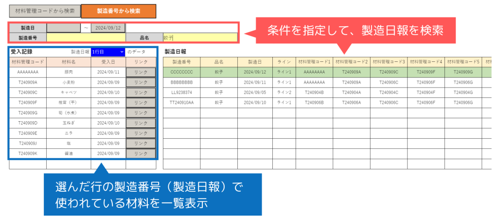 この帳票では、材料の受入記録(①)から製造日報(②)へ、またはその逆の2パターンのトレースが可能です。