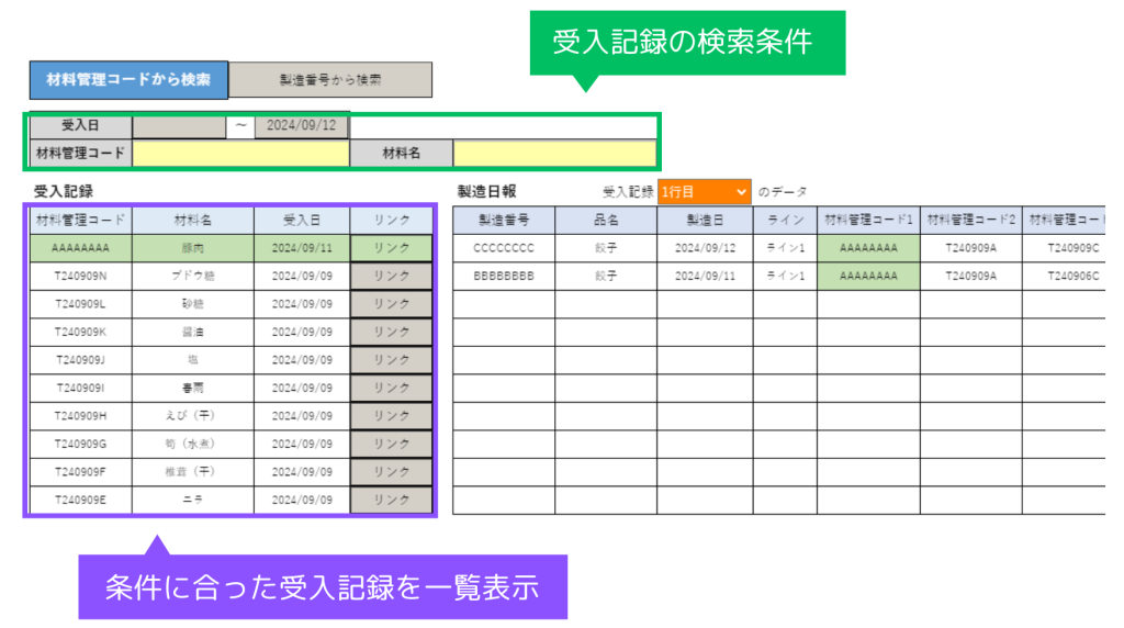 まず受入記録→製造日報の順に検索したい場合、「受入日」「材料管理コード」「材料名」で任意の条件を入力すると、まず関連する受入記録が検索され、材料管理コードや材料名などが画面の左側に一覧表示されます。
