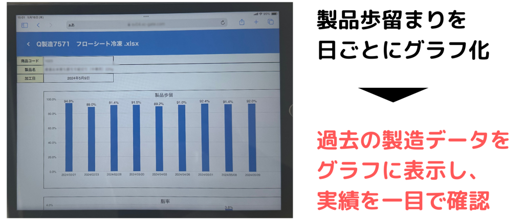 食肉加工メーカーのコープミート千葉様では、「XC-Gate(エクシーゲート)」を導入して生産記録を電子化し、歩留まりのグラフ化を実施しています。当日の歩留まりだけではなく過去の歩留まりも並べて表示することで、傾向を分析しています。また、「XC-Gate」の画面上でグラフ化するだけではなく、Excelでの自動集計も実現されています。