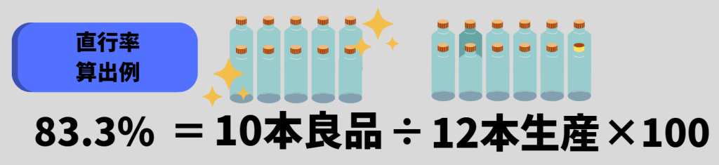 ちなみに、歩留まり率とともに使われることの多い用語として「直行率」があります。直行率とは、すべての完成品のうち、一度の工程・検査で良品になった製品の割合を指し、手直しにより良品に転換したものは含まれません。