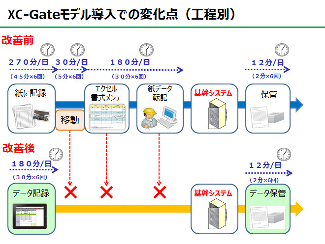 植物性油脂、業務用チョコレートなど食用油脂などの開発・製造・販売を行っている企業で、2018年に「XC-Gate」を製造現場に導入しました。業務棚卸しと改善を行った上で、現場の生産情報入力を紙からタブレットに置き換え、帳票書式の共通化によりExcel書式の調整やメンテナンスも不要となり、運用ルールも統一されました。