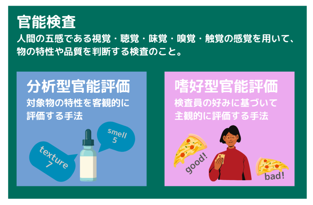 官能検査は、「人の五感」を使って製品の品質や特徴を評価する検査手法です。そのため、感覚に左右されないよう適切な環境と評価手順のもとで実施することが求められます。