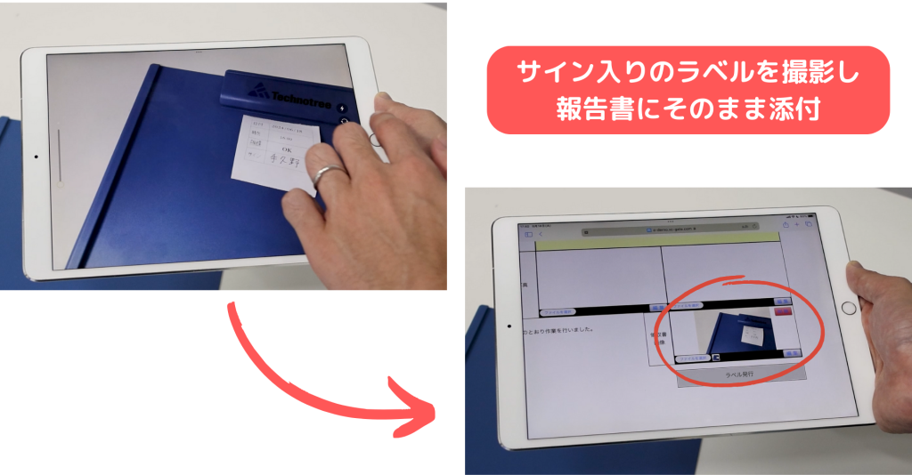また、XC-Gateには写真を貼り付ける「写真タグ」という機能もあるので、お客様の手書きサインが入ったラベルをその場で撮影し、作業完了の証跡としてデータ保存することもできます。
