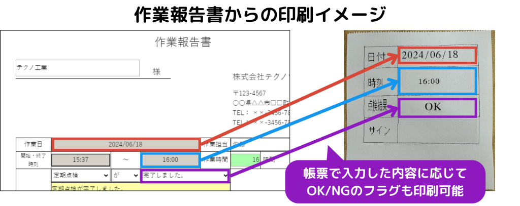 外出して作業を行う点検やメンテナンス業務においては、現地で作業報告書をXC-Gateへ記入後、そのままラベルに印刷してお客様に渡す、という運用フローが実現できるようになるので、作業記録のリアルタイムなデータ化と現地でのラベル発行の両立が可能です。