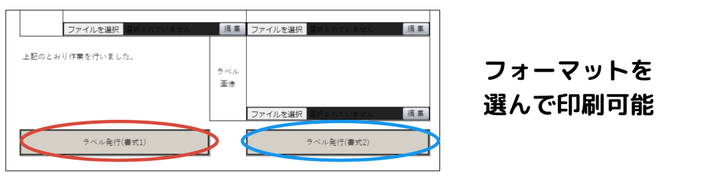 XC-Gateの実績登録ボタンとは独立して印刷用ボタンを作れるので、実績登録時以外の任意タイミングでラベルを発行できるほか、状況に応じて印刷フォーマットを使い分ける必要がある場合も、XC-Gateの作業報告書上に書式ごとの印刷ボタンを用意することで、面倒な設定なしに必要なフォーマットで印刷できる汎用性の高さもメリットの一つです。