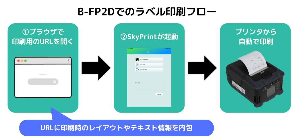 東芝テック社のポータブルプリンタ「B-FP2D」では、ブラウザから印刷専用のURLを開くことで、SkyPrintというアプリ(iOS/Android対応)を通してプリンタに印刷用のデータを送信し、印刷することが可能です。