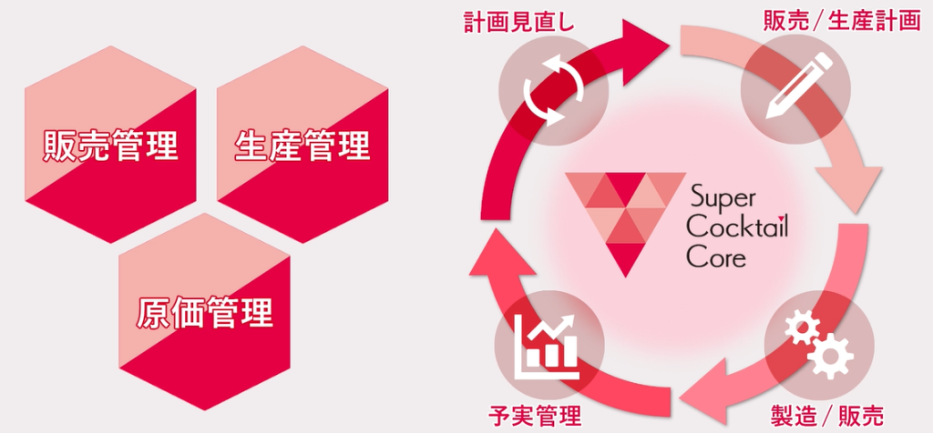 食品業・化学品業などのプロセス型製造業のお客様へ多く導入されている製販一体型の統合パッケージです。販売・生産・原価の3つのモジュールを選んで導入いただけます。3つのモジュールを統合利用いただくことで、在庫データの一元管理や過去の売上データから販売・生産計画、調達計画、製造指示へと業務へつなげることができます。「スーパーカクテルCore」は、現場の判断力を高め、販売の機会損失や在庫ロスの防止に貢献いたします。