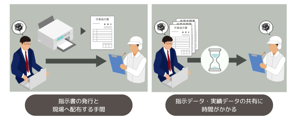 基幹システムを導入している場合、そのシステム内で生産指示を作成し、指示情報が記載された「作業指示書」を用いて生産活動を行われていることが多くあります。そういった場合、基幹システムから印字用のファイルが出力されるため、紙の作業指示書を現場に配布するといった運用を行われている現場も多く存在します。紙の作業指示書は、発行や現場への配布の手間がかかるほか、実際の生産数・不良数などの製造実績をパソコンへ入力しなおさなければならず、実績の反映までに長い時間がかかってしまいます。