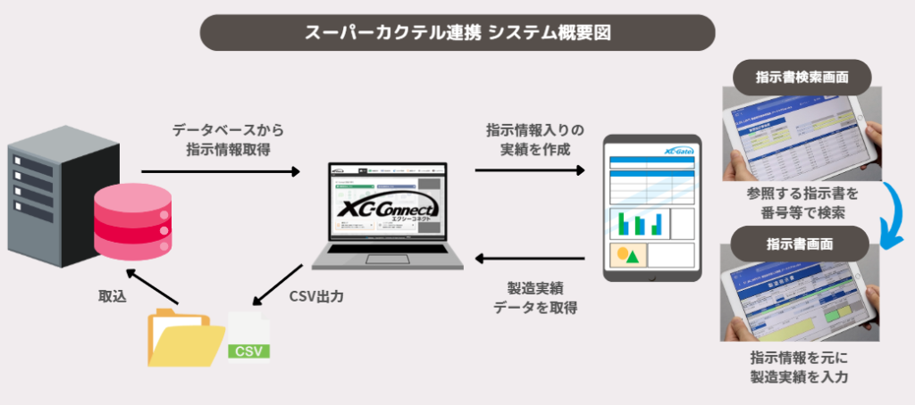指示データ・製造実績データのやり取りはXC-Gate.V3用の無料連携ツール「XC-Connect」を通じて行います。「スーパーカクテルCore」の指示データは、JDBC汎用(SQL)でデータベースを参照して「XC-Gate.V3」に登録し、「XC-Gate.V3」の製造実績データは、XC-Connectで取得してCSVを取り込める形式に変換することで、連携を実現します。