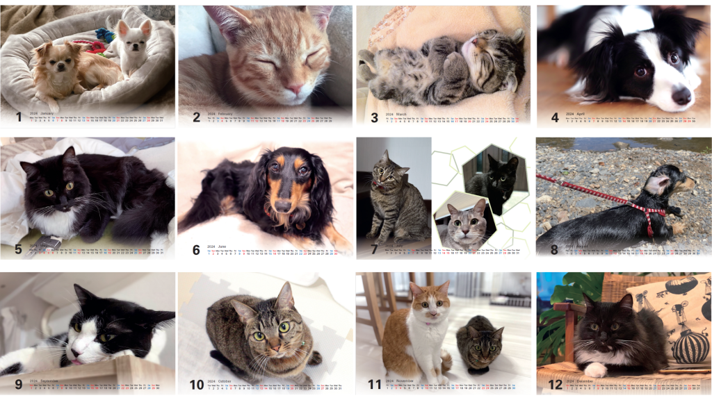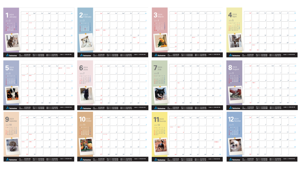 何度かこのXC-Timesでもご紹介しておりますが、テクノツリーカレンダーは弊社従業員のペットたちが登場する動物好きにはたまらないカレンダーとなっております。今回の2024年版は3年ぶりのペットカレンダーです。きっといるであろう隠れファンの方々に向けて、本記事で中身をたっぷりご紹介させていただきます!