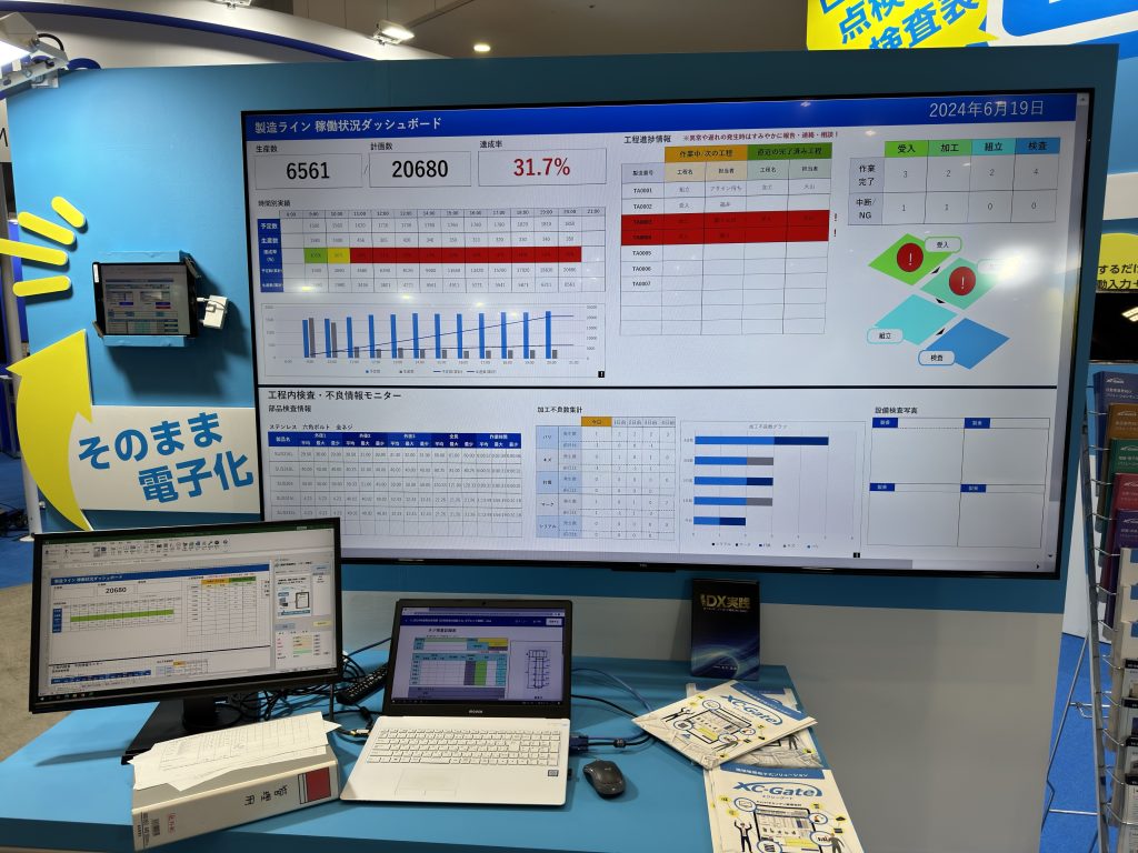 大きなモニターではXC-Gateで入力・蓄積したデータの活用方法の1つとして、製造ラインの稼働状況ダッシュボードという集計画面を展示しておりました。こちらの画面も現場帳票電子化システム「XC-Gate」では、すべてExcelだけで作成・設定することができます。