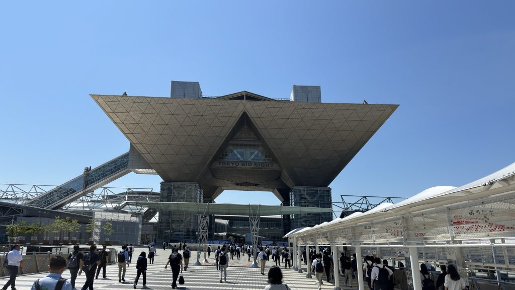 余談ですが、前日の18日は全国的な大雨に見舞われ、東海道新幹線の運休もありましたが、開催初日・2日目は快晴!東京ビッグサイトの象徴的な逆三角形の建造物も青空で映えていました。(最終日はあいにくの雨でしたが…)